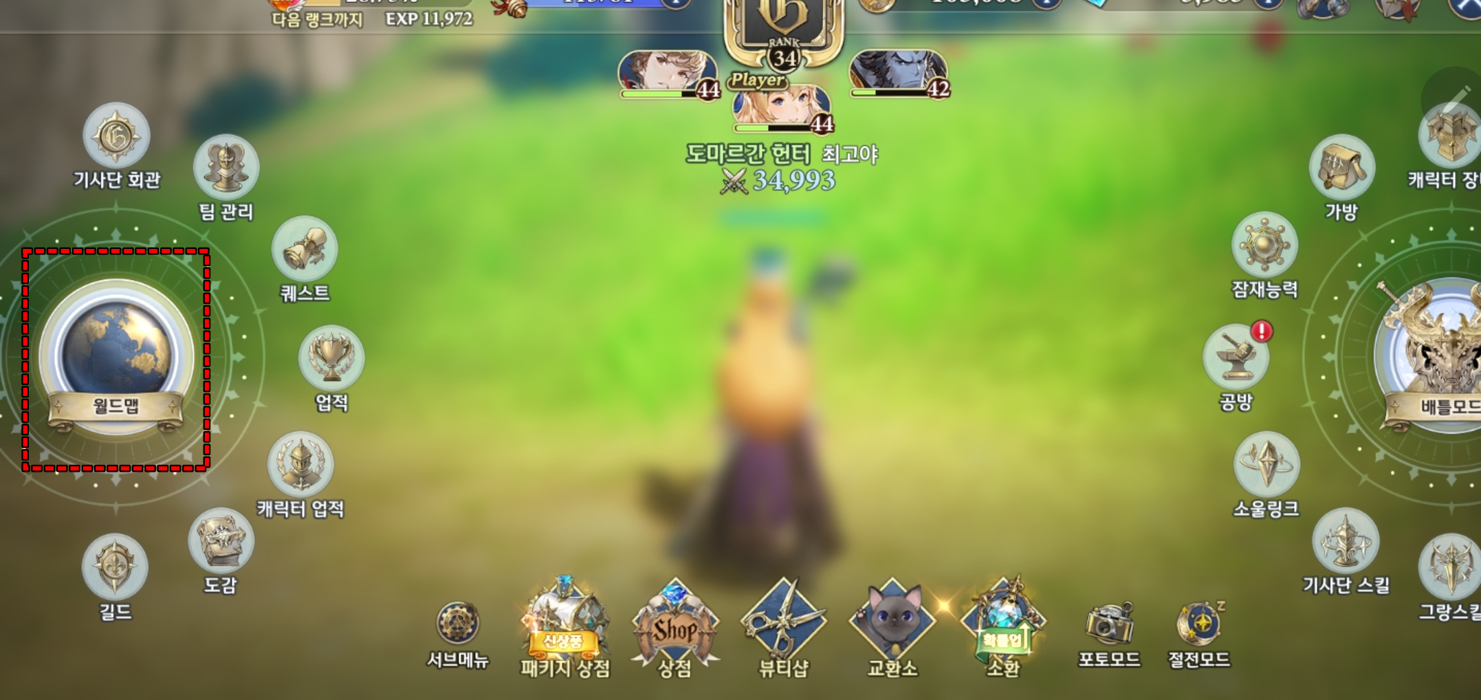 그랑사가 서브퀘스트를 확인하기 위해 메뉴에서 월드맵을 엽니다.