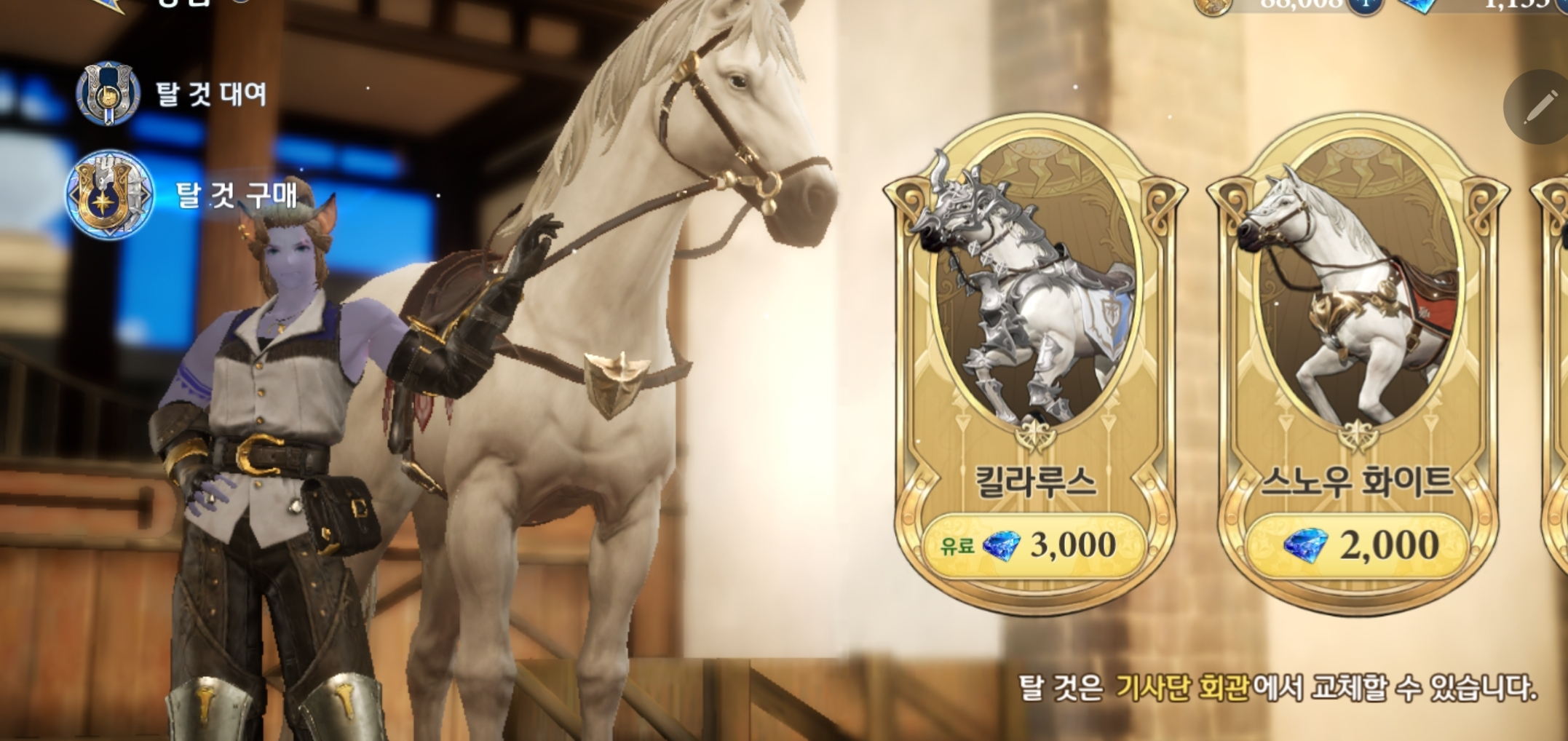 초반에 말을 24시간 대여해주는데요. 정말 하루가 지나면 없어지더라고요. 그래서 필드를 뛰어다니며 퀘스트를 하니 인내심에 한계에 봉착. 바로 마그나데아로 가서 탈것을 눌러줍니다. 탈것은 대여와 구매로 나눌 수 있는데요. 30,000 골드를 내가 24시간 대여 혹은 최저 2,000 다이아로 말을 구매할 수 있습니다. 3,000 다이아 말이 조금 더 이뻐 보이긴 하지만 가성비를 따져서 패스.