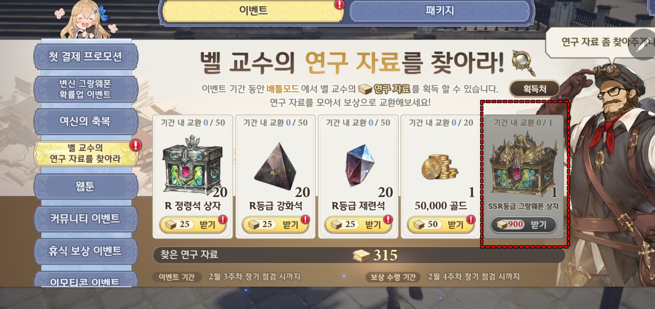 그랑사가 진행중인 이벤트 - 벨 교수의 연구 자료 찾기. 900개 모을때까지 한 눈 팔기는 금물