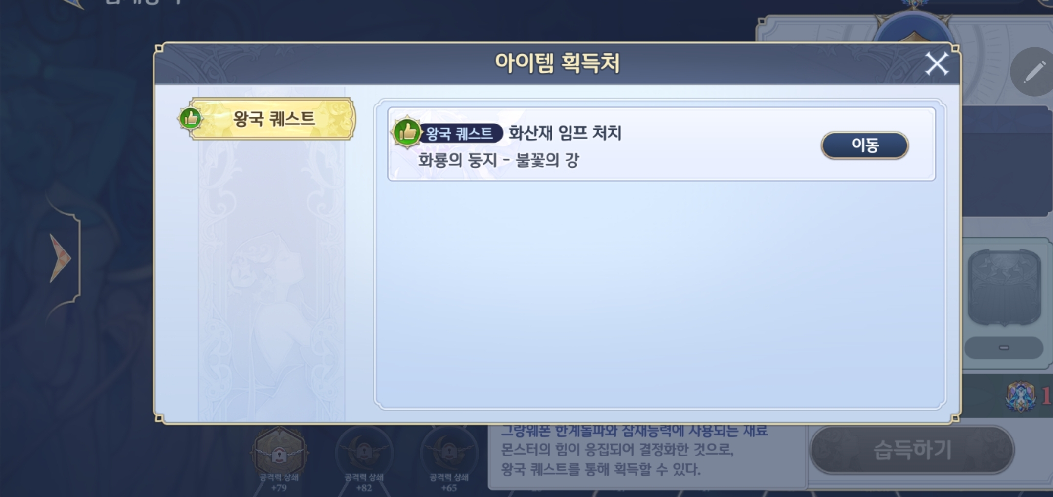 재료를 클릭해보면 어떠한 왕국 퀘스트를 해야 하는지 알 수 있습니다. 그랑웨폰 한계돌파 재료로도 사용되니까 참고하세요.
