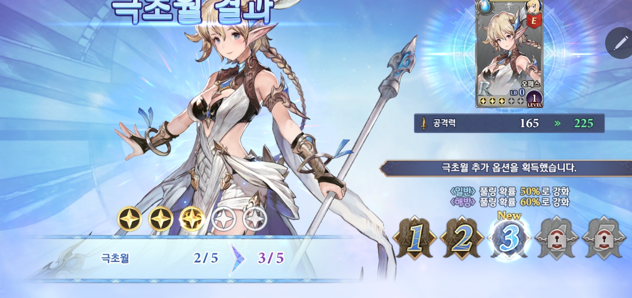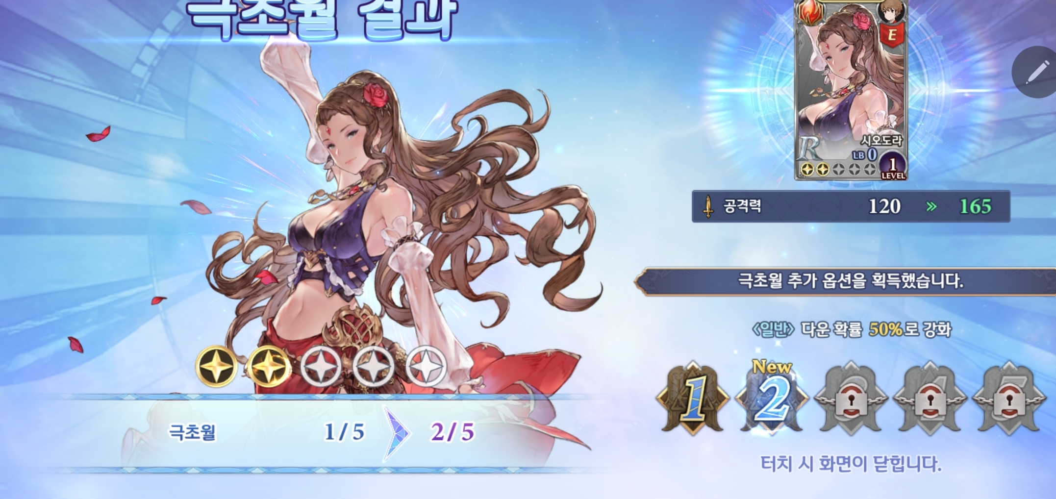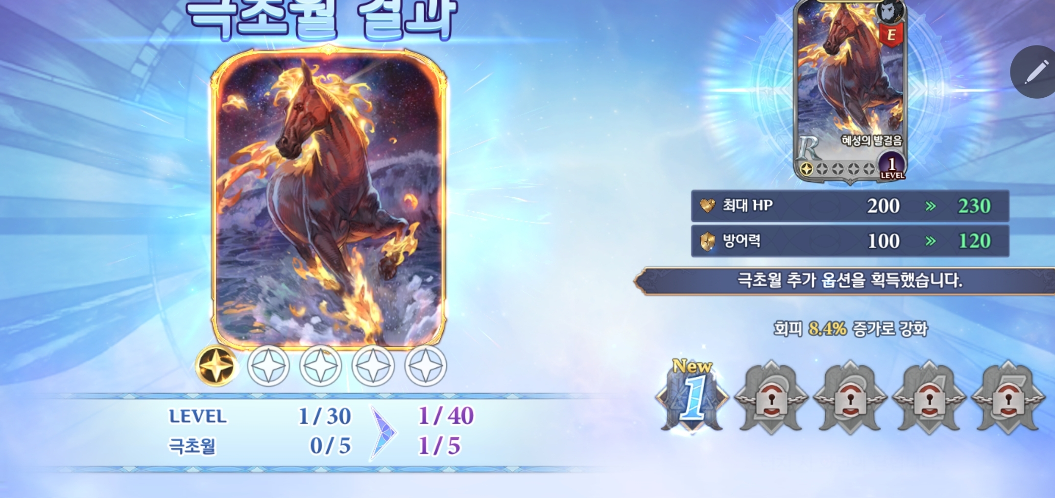 프리티아 1 극초월 결과 : 능력치 향상 및 우측 하단에 1이 오픈되며 추가 옵션을 획득함을 알 수 있어요.