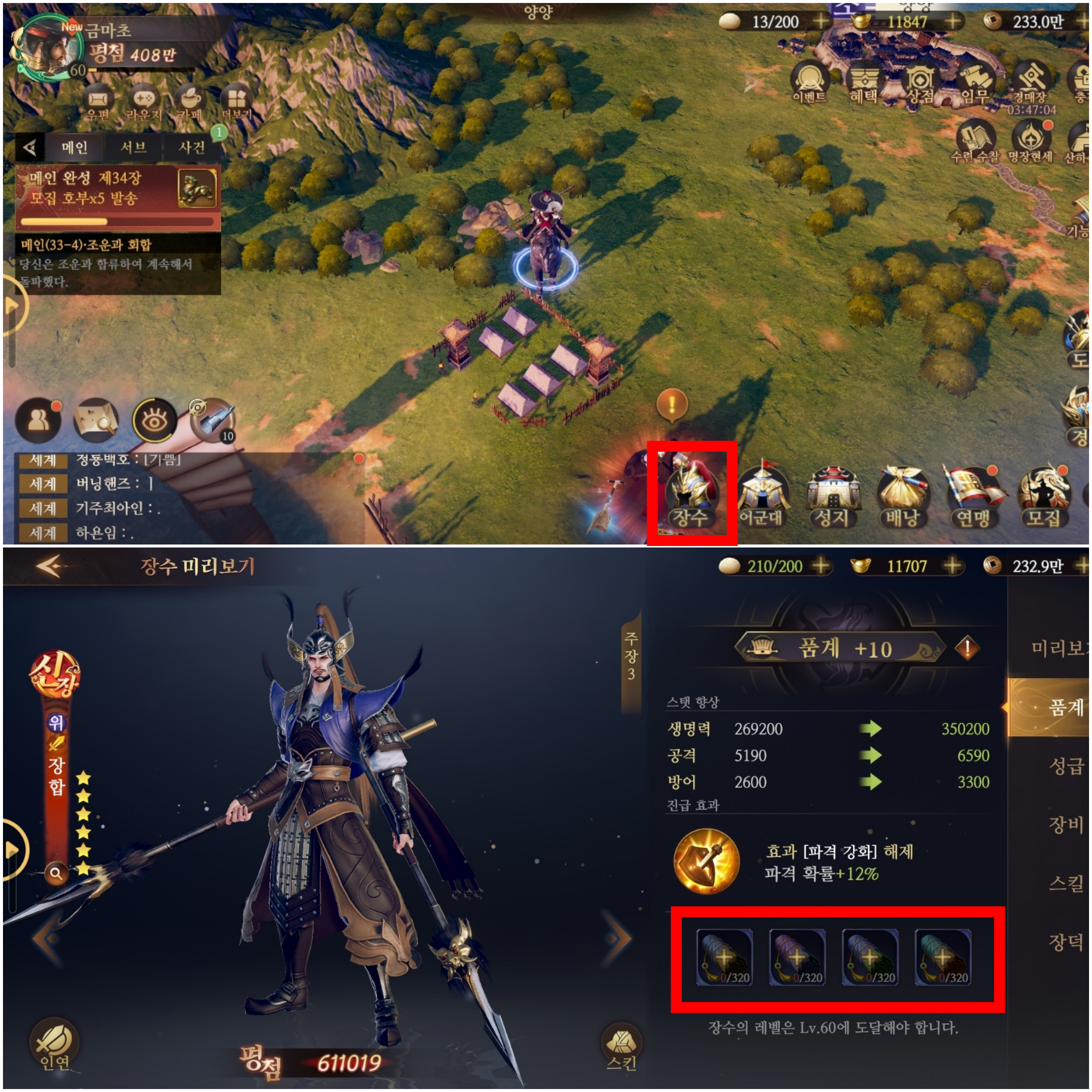 장수 스탯을 올리는 방법이 여러 가지 있습니다. 초반에 명장(금색) 장수를 뽑으면 기본 스탯이 높아서 유리합니다. 그렇다고 리세마라를 하기에는 시간이 오래 걸리기 때문에 추천하지 않습니다. 게임을 진행하다 보면 금화(원보)가 쉽게 모입니다. 모집호부를 모아서 장수를 뽑던지, 매일 저녁 9시부터 시작되는 경매에 입찰하면 쉬게 명장을 획득할 수 있습니다. 또한 명장이 아니더라도 승급하여 성수가 높아지면 더 강력해집니다. 가장 하급인 장수가 6성이 되다면 태생 4성(명장) 보다 더 좋은 효율을 보여줍니다. 그러므로 조각이 나오는 대로 모아서 바로 승급시키는 것을 추천합니다.