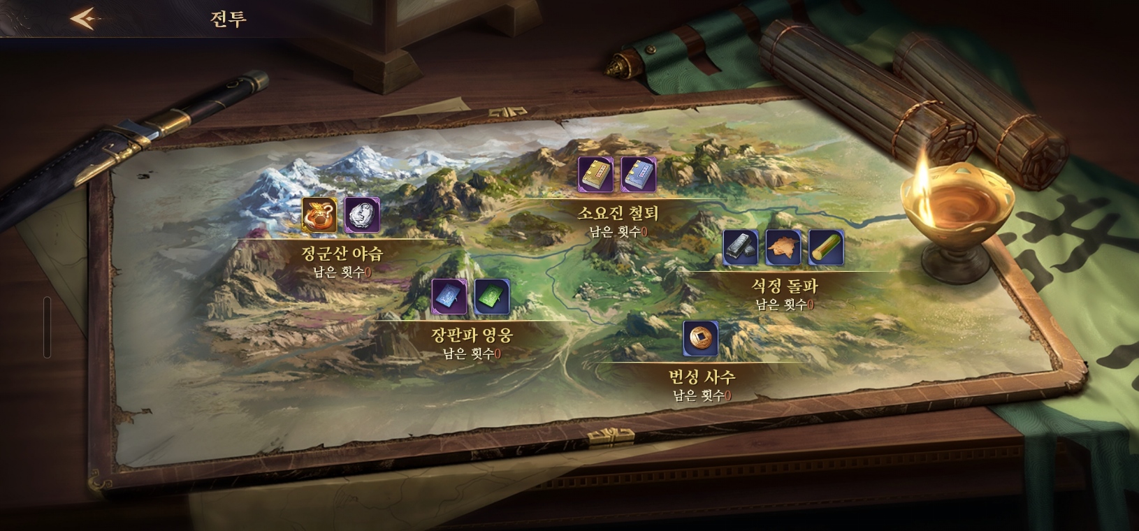 레벨을 올리기 위해서 장서를 먹여야 하는데요. 다음과 같은 곳에서 얻을 수 있습니다. 이 중에서 가장 경험치를 많이 높일 수 있는 것이 장판파 영웅입니다. 기병과 보병 장수의 조합으로 장판파 좌우측에서 몰려오는 적을 처치하는 던전입니다. 하루 3번 돌 수 있으며, 더 높일 수 없다면 소탕으로 돌려도 됩니다. 레벨업에 필수!