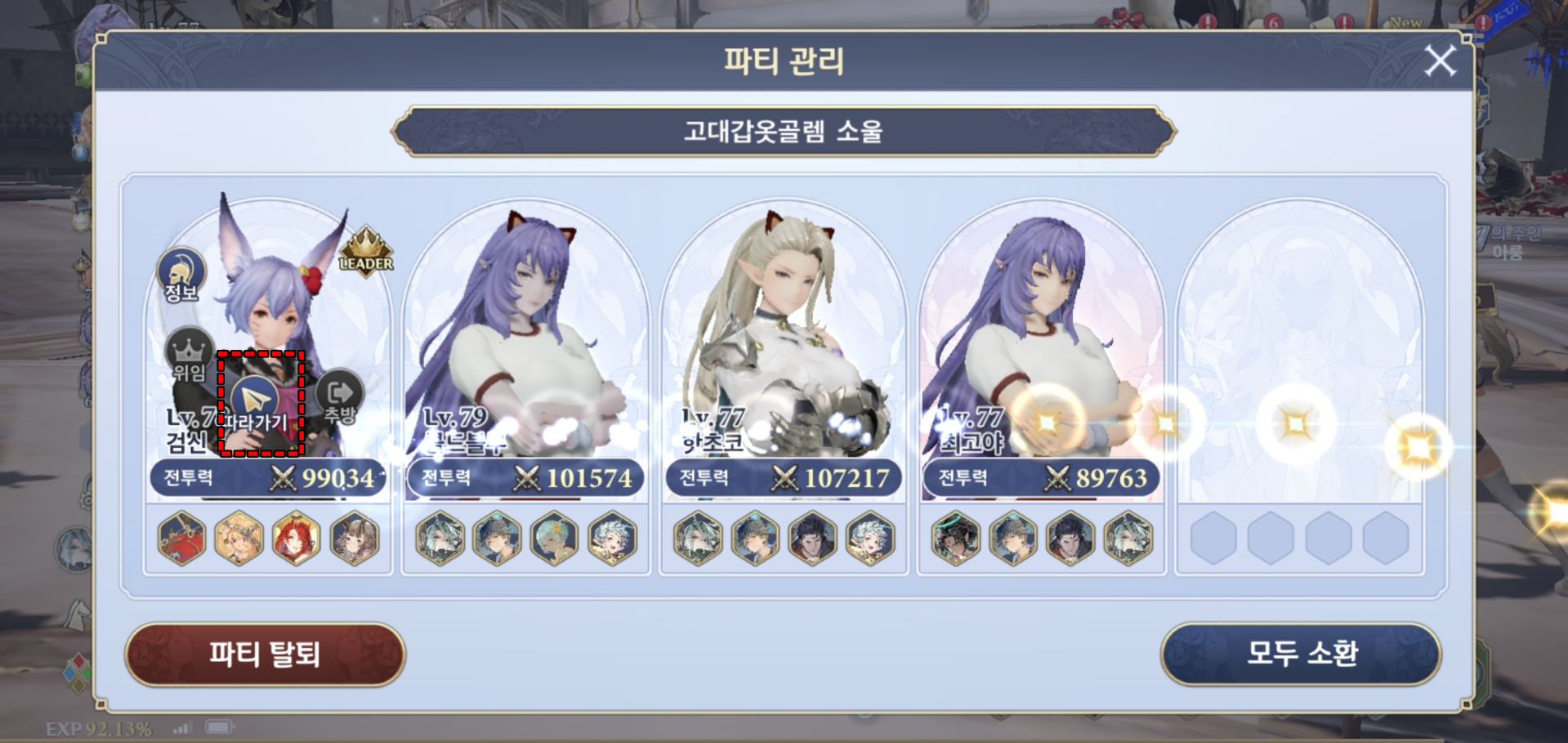 순간이동의 비법은 바로 파티를 활용하는 것입니다. 아래 화면처럼 붉은색으로 된 파티 참가를 눌러주세요.