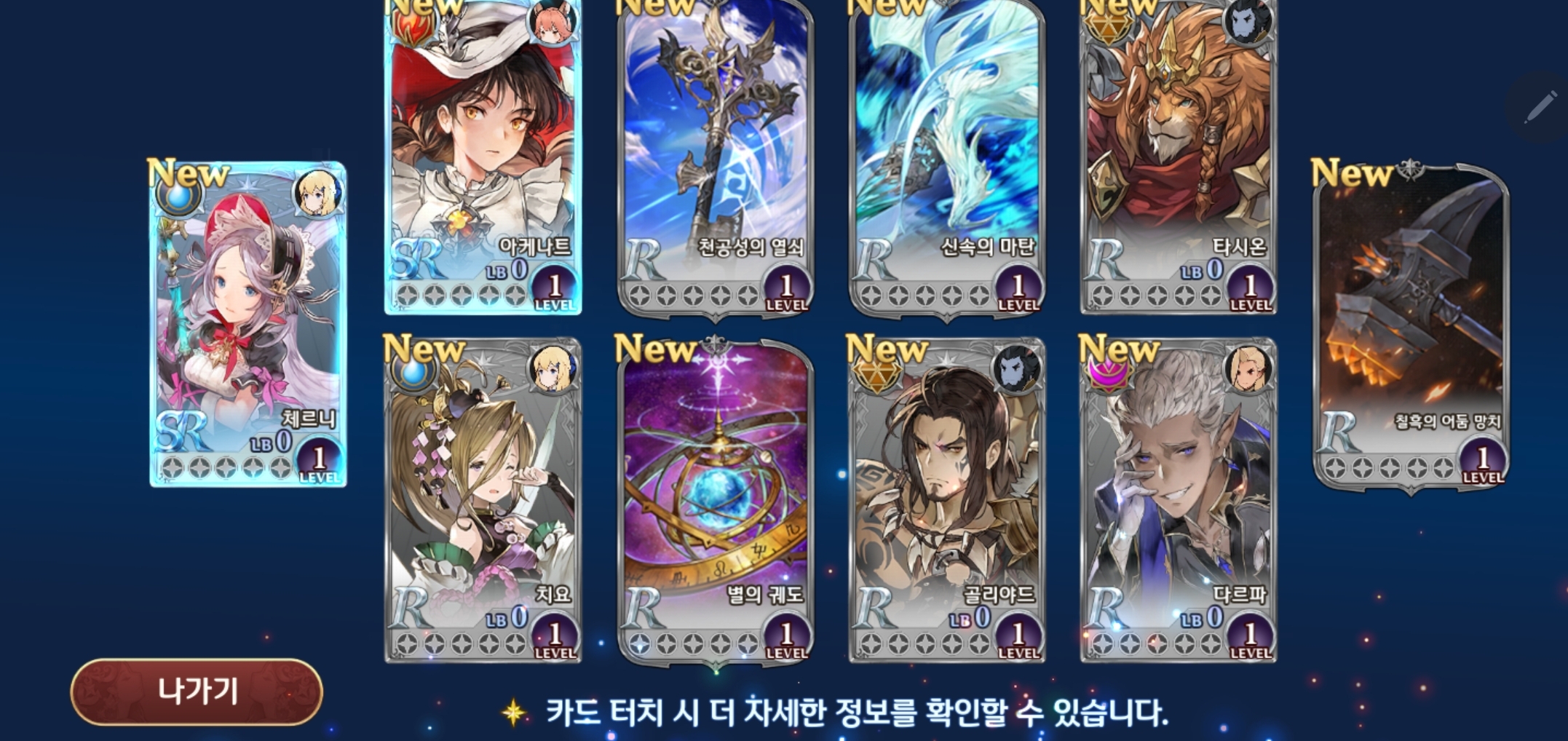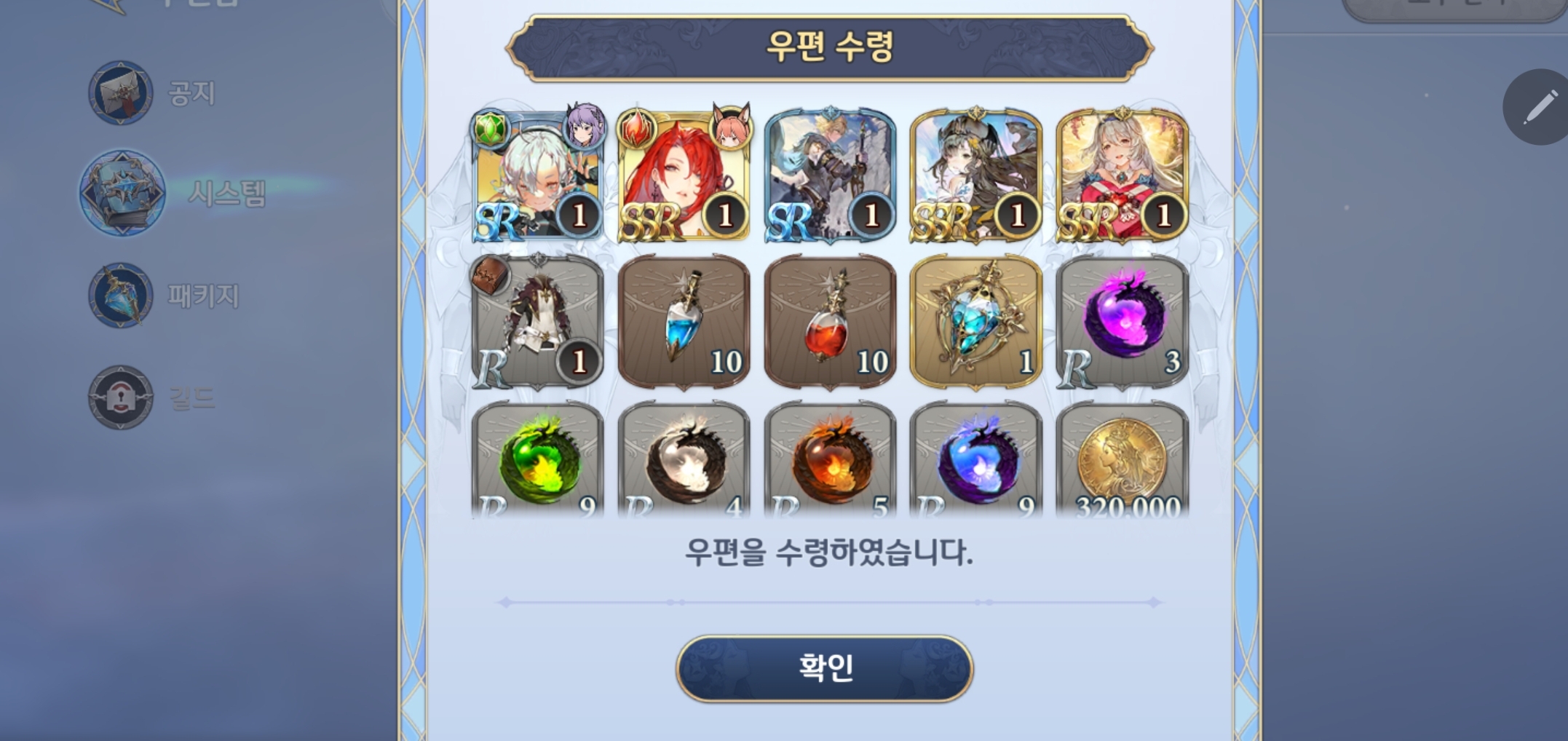 10 연속 뽑기 결과 SSR이 나온적이 거의 없었습니다. 대신 우편함에 있는 것을 열어보면 확정으로 SSR 그랑웨폰 1개와 SSR 아티팩트 2개를 주는데요. SSR 그랑웨폰은 매번 달랐습니다. 처음 우편수령했을 경우 SSR이 있었는데요 1.5 티어라 리세마라를 했습니다.