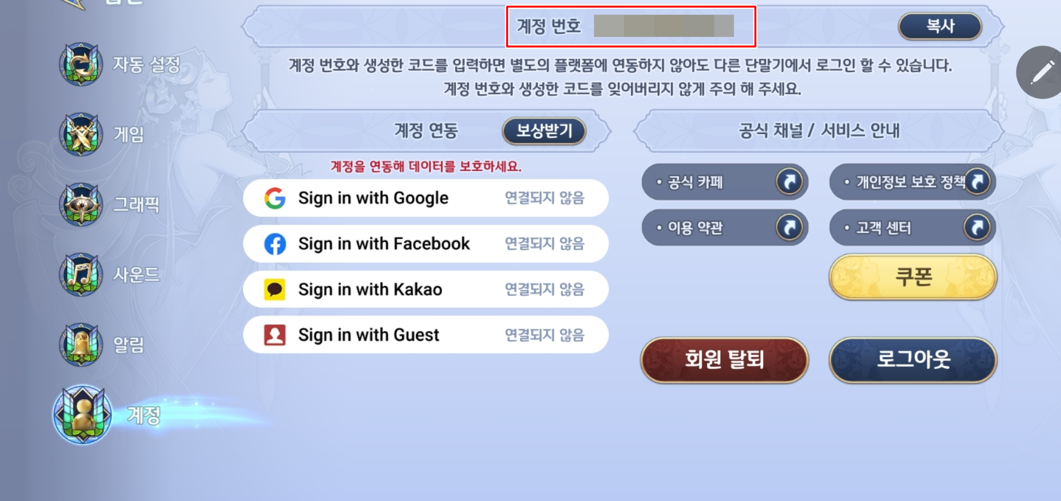 계정 번호가 보일 거예요 캡처해두세요. 캡처해둔 계정 번호는 PC버전이나 다른 휴대폰에서 로그인할 때 사용할 수 있어요. 리세마라니까 마음에 드는 SSR 그랑웨폰이 나오고 나서 계정 연동을 해도 늦지 않습니다.