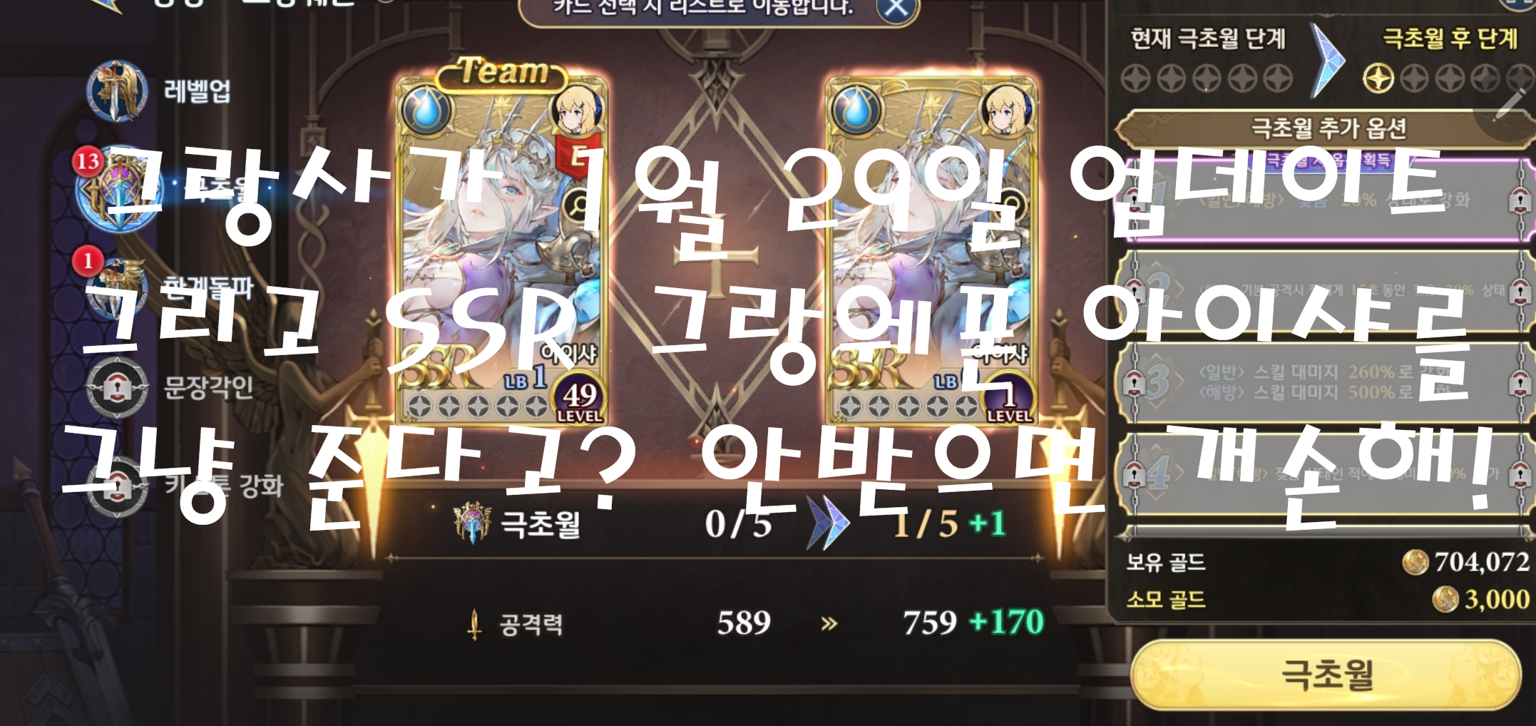 1월 29일 오늘 9시로 그랑사가가 업데이트를 완료하였습니다. 마켓 1위 기념으로 인기투표 1위를 차지한 SSR 변신 그랑웨폰 아이샤를 푸시로 뿌렸는데요. 필자는 분노의 극초월을 진행했습니다. 아이샤 뽑느라 리세마라를 5번이나 했는데 말이죠. 이제 아이샤 없어서 리세마라하실 필요가 없으시니 참고해주세요. 1월 29일 업데이트 내용 및 향후 어떤 방식으로 이득을 취할지 살펴보겠습니다.