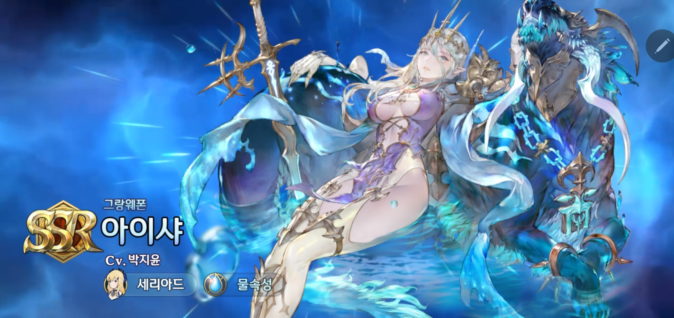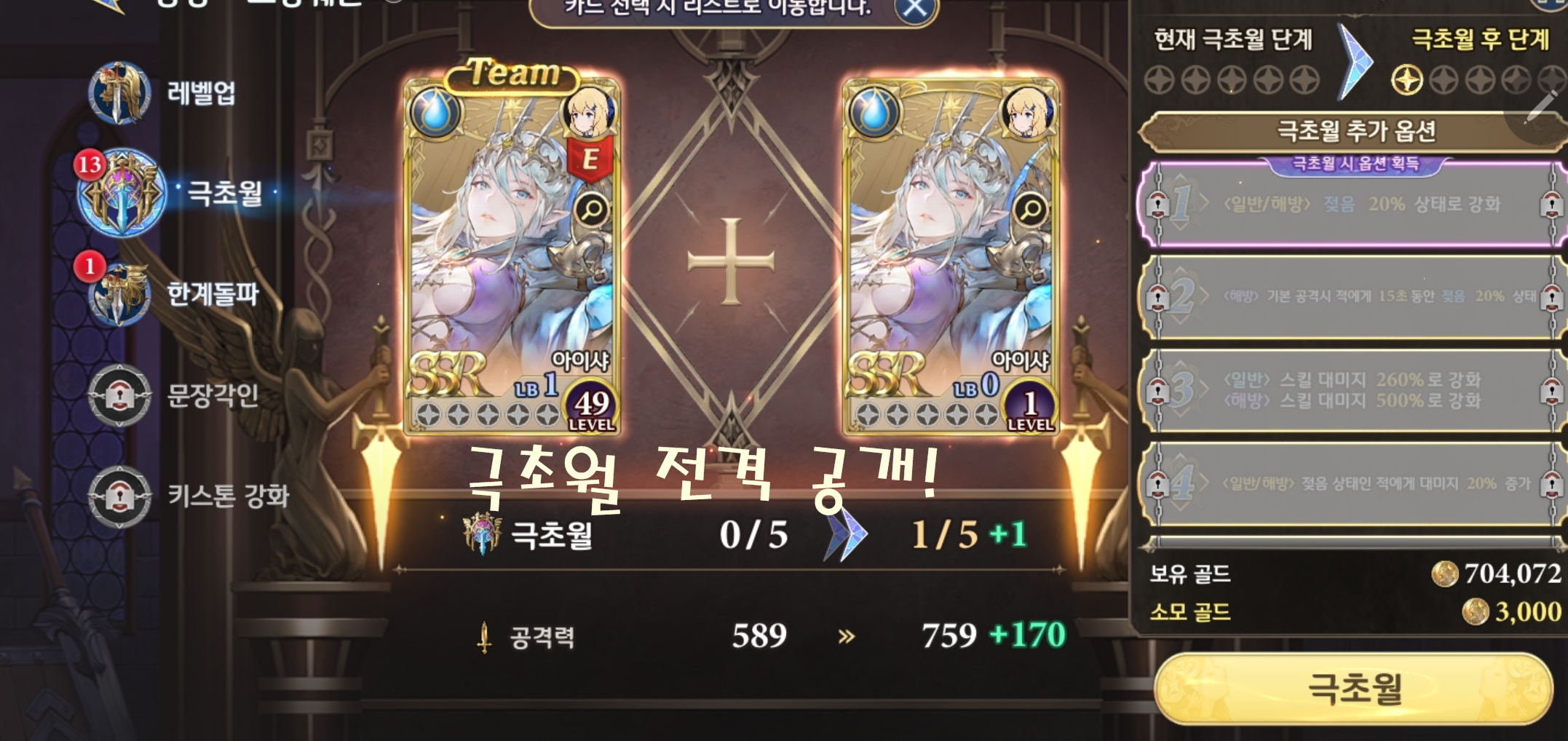 필자의 유일한 SSR 그랑웨폰인 아이샤! 하나 더 주는 건 고맙지만 중복입니다. 하지만 저에게는 극초월이 있었습니다. 아이샤 극초월 대공개. 과연 어떤 옵션이 붙을까요? 개봉박두!