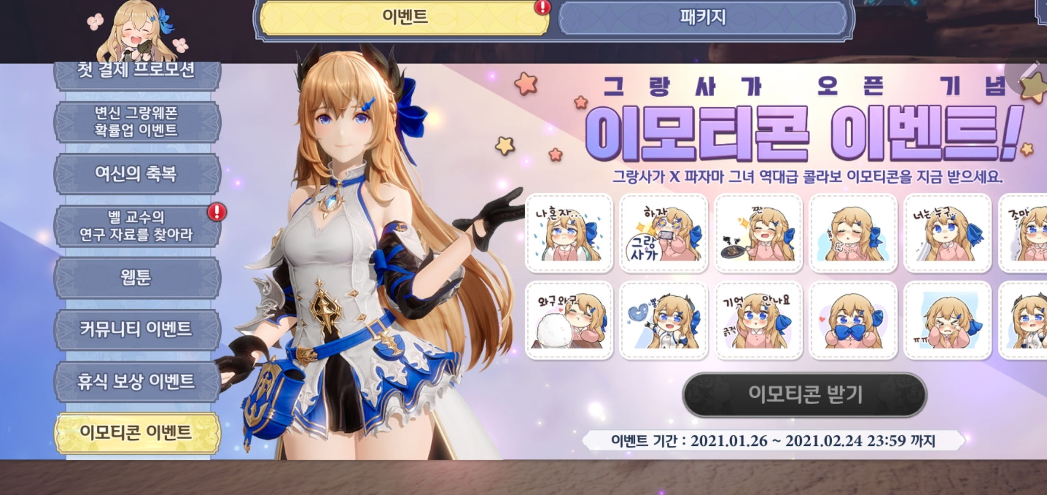 2월 1주차 정기점검까지 변신 그랑웨폰의 확률 증가입니다. 다이아를 많이 비축했다가 러시해보세요! 아직까지 다이아를 효율적으로 사용하는 방법은 그랑웨폰 뽑기가 최고입니다!