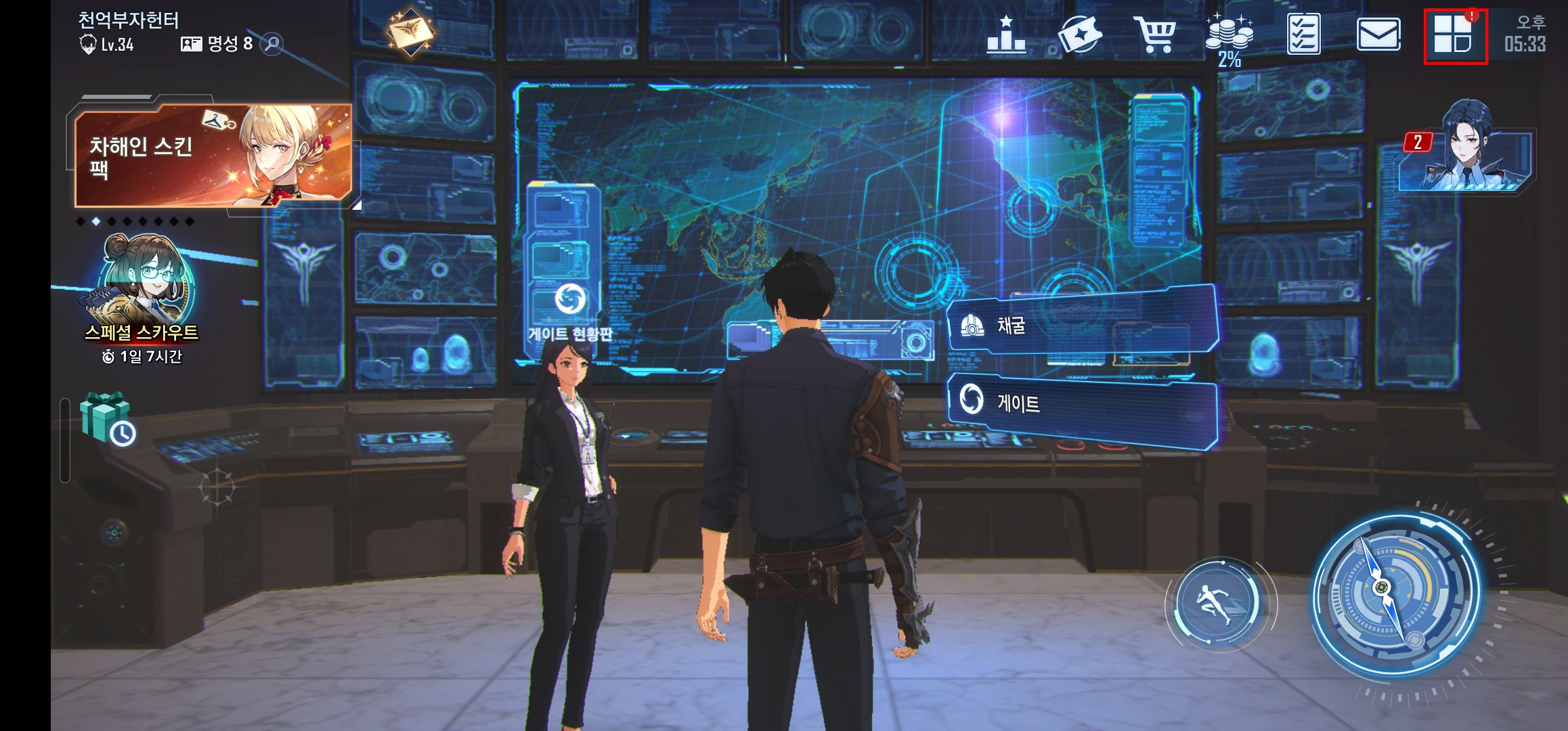 이 게임에서는 헌터 뽑기를 위한 재화는 마정석입니다. 간간히 게임 화면에 나타나는 S급 헌터들과 꼭 대화하시고 마정석도 챙겨주세요. 또한 활동 지원금도 일정시간이 지나면 누적됩니다. 무과금 게임 유저분들도 받을 수 있으니 꼭 챙겨주세요.
