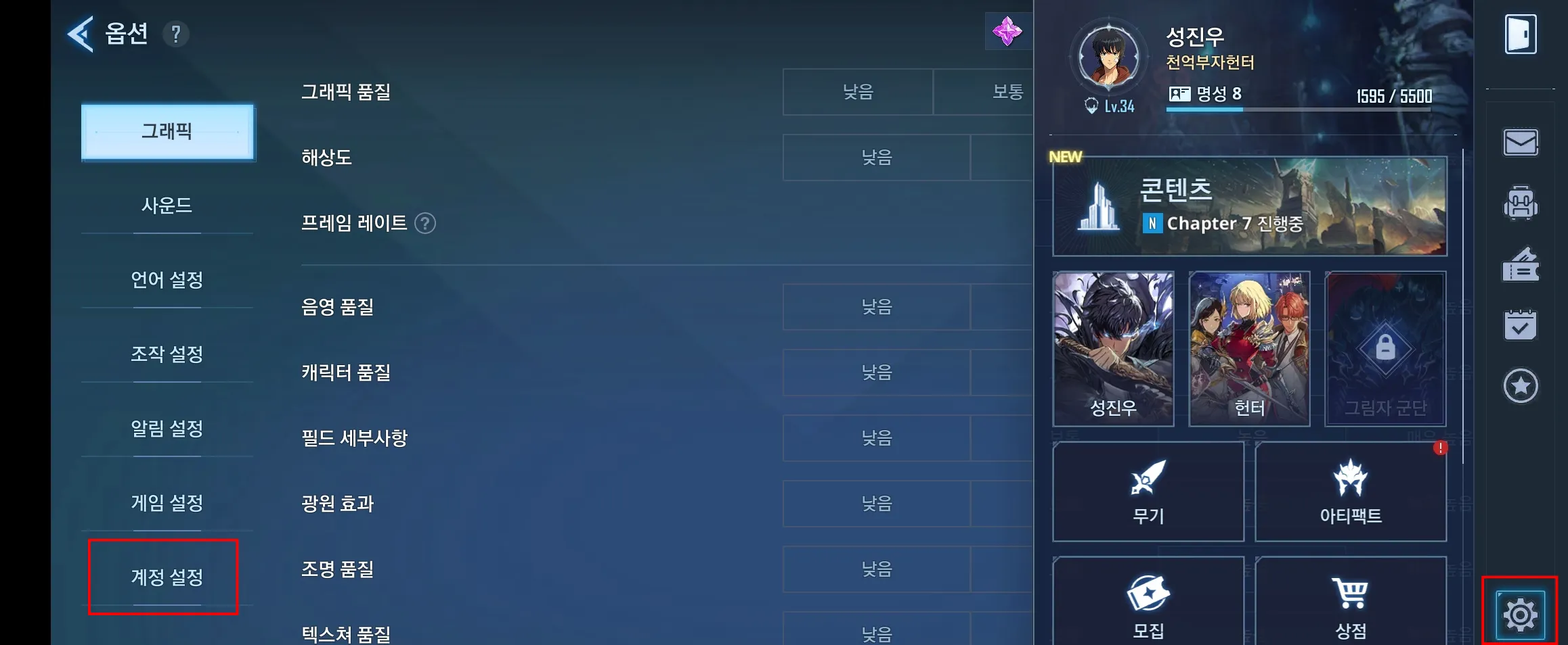 메뉴화면에서 우측 하단에 톱니바퀴모양을 클릭합니다. 나오는 좌측 메뉴에서 계정 설정을 클릭해 주세요.