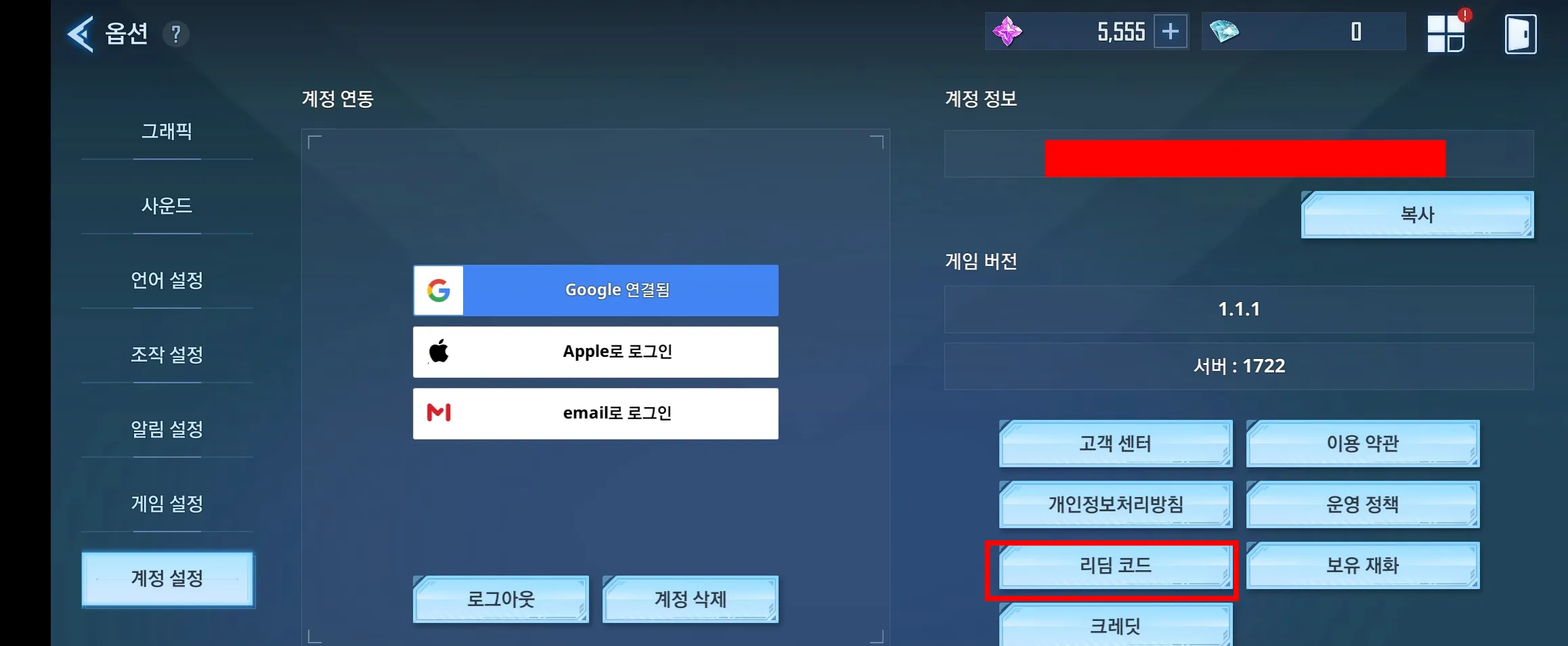 계정 설정 화면에서 우측에 리딤 코드 메뉴가 나와요. 이곳에 위에 언급한 쿠폰번호를 입력하는 것입니다.