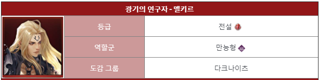 멜키르는 다크나이츠에 속합니다. 도감 그룹에 다크 나이츠가 추가되겠네요. 또한 만능형 영웅으로 균형적인 스탯을 보유하고 있을 것으로 추정합니다. 만능형은 숙련 작업을 하면 대부분 피통이 올라갑니다.