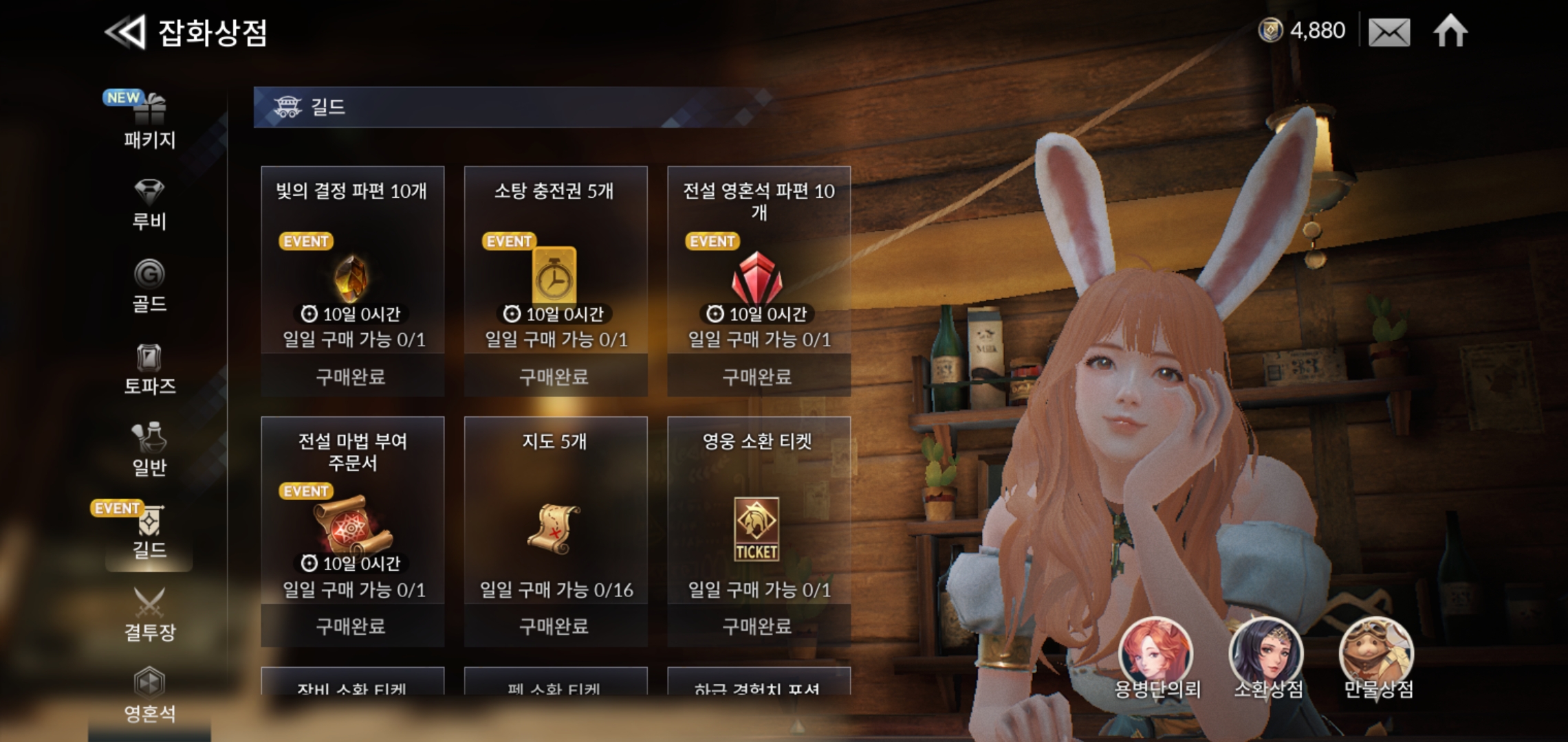 하지만 소리소문 없이 업데이트된 내용이 있는데요? 아직 구매하지 않으신 분들은 길드 상점으로 고고~! 전설 플러스 (빛나는 전설템) 아이템을 제작하기 위한 재료인 빛의 결정 파편, 소탕 충전권 5개, 전설 영혼석 파편 10개, 전설 마법부여 주문서를 뿌리고 있습니다. 남아도는 길드 포인트 아낌없이 투자해주세요!