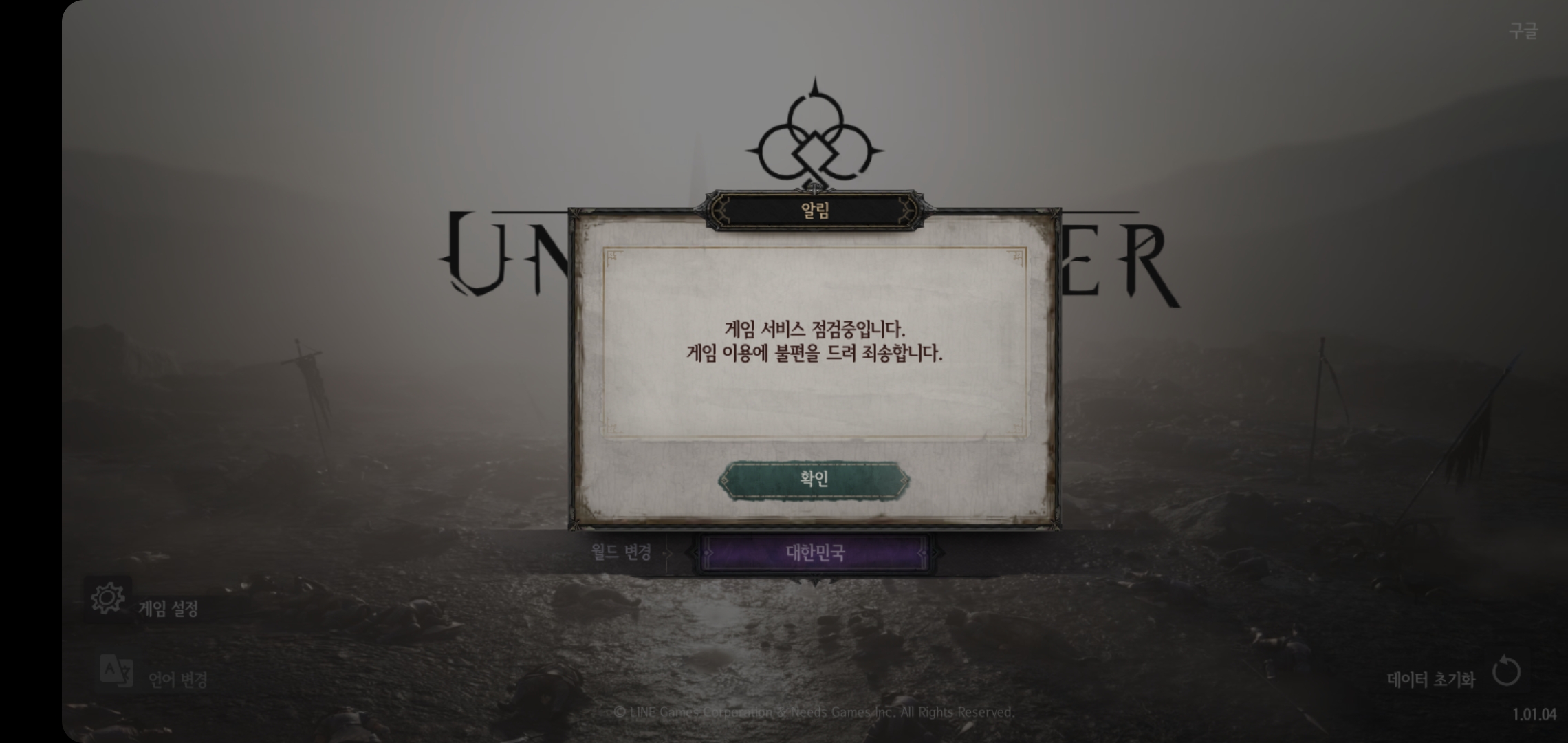 언디셈버는 사전에 유저들이 많이 접속할 것이라고 예상하지 못했을까요? 오픈과 동시에 폭발하고 말았나 봅니다. 바로 계속 점검 중이 뜹니다. 아니 이게 오픈일부터 웬걸?