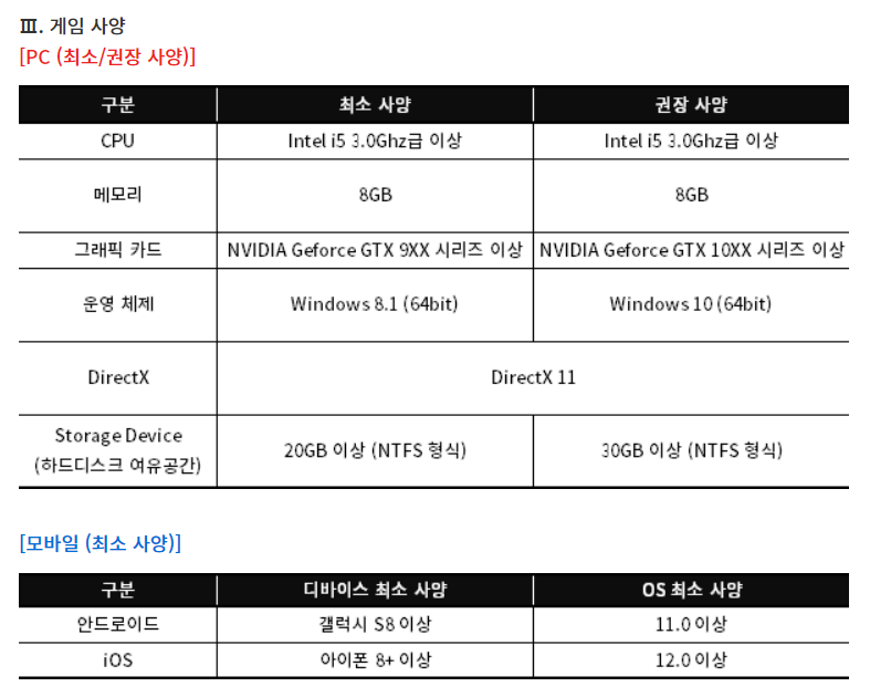 PC 및 모바일 설치 최소 권장사양은 다음과 같습니다. 고사양이라 필자도 나중에 폰을 바꿔야할 수도 있겠네요.