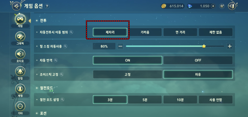자동사냥을 돌리는 꿀팁은 설정입니다. 먼저 옵션에서 게임으로 들어가 전투란에 자동전투시 이동 범위를 제자리로 설정해줍니다. 이제 목표로 하는 마물이 2-3마리 몰려있는 곳에 두고 자동사냥을 돌리고 절전모드로 두던가 AI모드로 돌려두면 영혼석이 가득 모여있을 것입니다. 참고로 영혼석은 잘 모이지만 특산물은 정말 안 나옵니다. 콜렉팅 아로마를 많이 모아두셨다면 안 모이는 특산물을 구하실 때 사용해 보시기를 추천합니다.