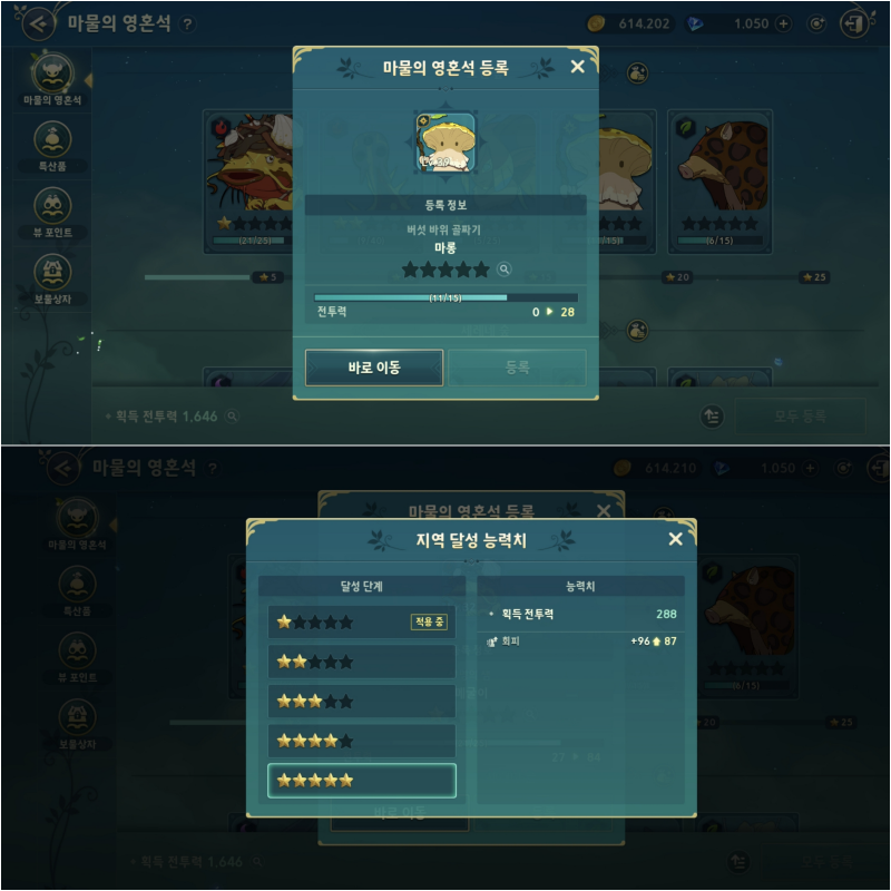 레벨업과 장비업 이외에 도감 작업을 통해서 전투력을 올릴 수 있습니다. 사냥을 하다 보면 필드에서 마물의 영혼석을 얻을 수 있습니다. 영혼석을 등록하면 각 마물 별로 특정한 속성이 올라가서 전투력이 향상됩니다. 또한 지역별로 달성치도 있기 때문에 휴식할 때 완성하지 못한 마물을 클릭해서 사냥하면 도감을 채울 수 있습니다.
