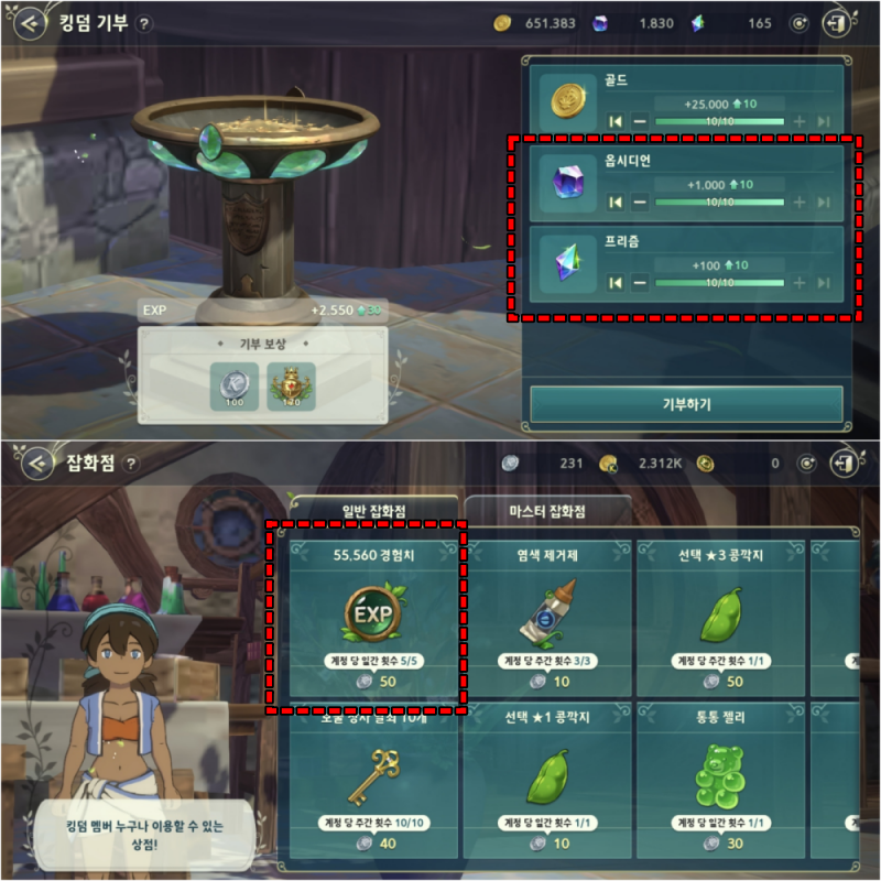 제2의 나라를 더욱 즐기고 콘텐츠를 모두 이용하기 위해 킹덤 가입은 모두 하셨을 거라 믿습니다. 킹덤에서 기부를 할 수 있는데요. 골드는 부족하면 아까울 수 있지만, 옵시디언과 프리즘은 아끼지말고 기부해주세요. 기부하고 받은 재화로 킹덤 잡화점에서 경험치를 살 수 있습니다. MMO RPG는 레벨발과 장비발입니다. 경험치 아이템을 아껴두었다가 레벨업이 잘안되는 구간에서 사용하는 것을 추천합니다.