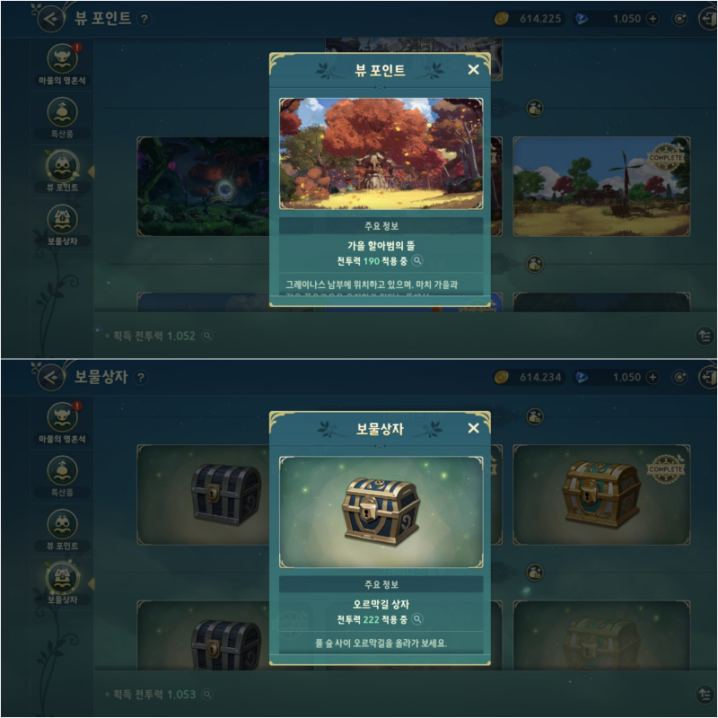 제2의 나라 도감작업에서 무시할 수 없는 2가지 요소가 더 있습니다. 바로 뷰포인트와, 보물상자입니다. 마물 영혼석은 계속 몬스터를 잡아서 모으는 것이지만 뷰포인트와, 보물상자는 1번씩만 찾아서 클릭하면 완수됩니다. 1번 클릭으로 전투력을 200 가까이 올릴 수 있습니다. 뷰포인트 힌트는 도감에 나와있는데요. 여러 곳이다 보니 추후 정리해서 1번에 공유해드리겠습니다.