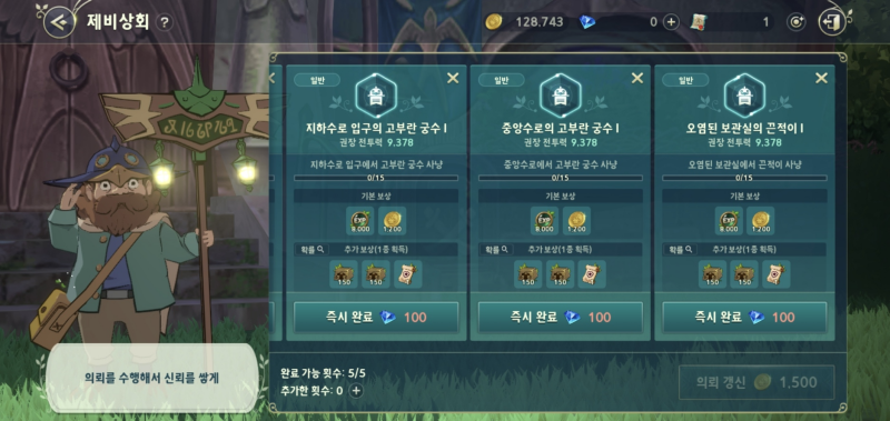 현재로써는 초반에 장비 제작 재료를 받을 수 있는 퀘스트로 제비상회 퀘스트가 있습니다. 하루 5회 진행하실 수 있으며 리셋 티켓을 얻으면 수량만큼 추가로 진행하실 수 있습니다. 장비 제작을 위해 꼭 진행해주세요. 한 가지 아셔야 할 것은 퀘스트마다 랭크가 있어서 높은 랭크의 퀘스트를 진행하시면 보상이 더 좋은 것이 나옵니다. 하지만 극초반이라 낮은 랭크 위주로 나오니 빠른 렙업이 유리합니다.