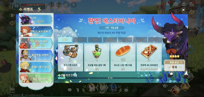3. 환영 에스타바니아 : 위에 이미 설명드린 대로 4성 투왕을 드립니다. 진행할 것이 좀 많아서 오래 걸리지만 4성이니 인내하시고 진행하시기를 추천합니다.
