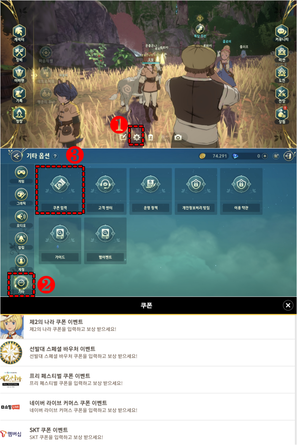 게임 우측 상단 메뉴를 누르면 하위 메뉴가 나옵니다. 거기서 첫 번째로 톱니바퀴 아이콘을 눌러주세요. 둘째로 좌측 제일 하단 기타 버튼을 눌러주세요. 세 번째로 쿠폰번호를 눌러주세요. 마지막으로 다양한 쿠폰 이벤트가 있음을 보실 수 있습니다. 해당하는 쿠폰 번호 네이버 라이브 커머스 쿠폰, 프리 페스티벌 쿠폰을 찾아서 눌러주세요.