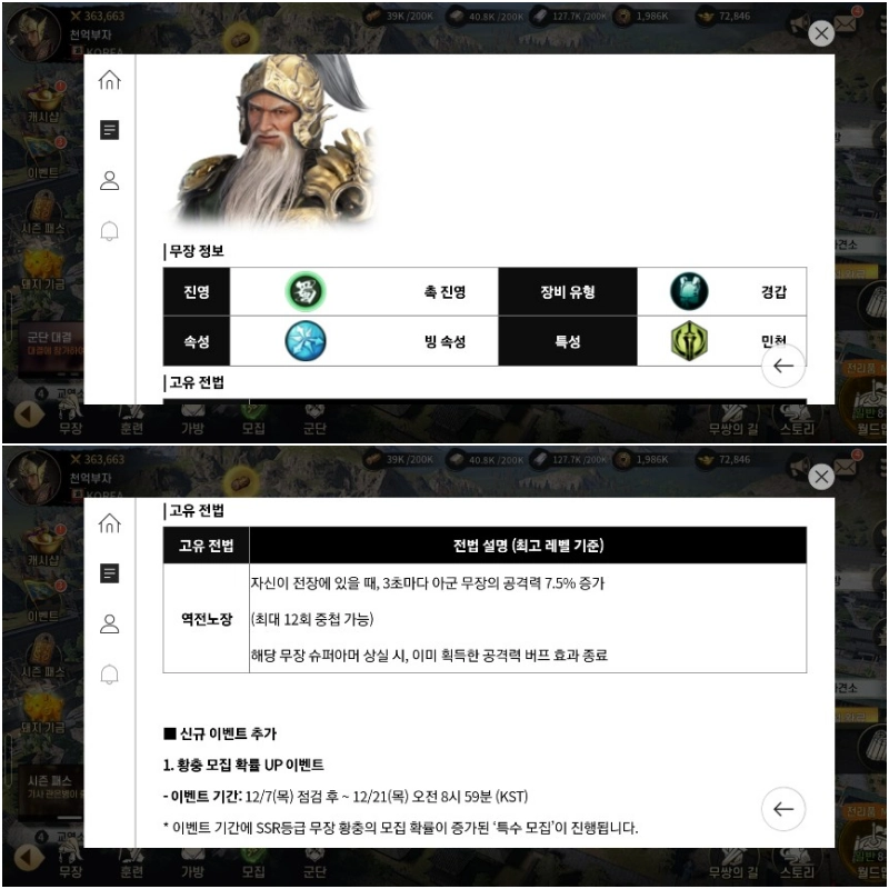 그런데 황충의 진가는 여기서 끝나는 것이 아니죠. 바로 고유 전법인 역전 노장에 있습니다. 자신이 전장에 있을 때 3초마다 아군 무장의 공격력이 7.5% 증가하며 최대 12 중첩이 가능하죠. 공격력 뻥튀기 조합의 최강이라 할 수 있죠.