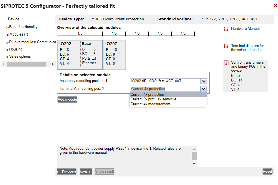 Redundant Power Supply는 계전기의 전원을 2중화하는 것입니다. 즉 신뢰성을 더 높여줄 수 있는 것이죠. 전원 1이 고장이 나도 계전기가 꺼지지 않고 전원 2로 동작할 수 있습니다. 아래에서 필요한 BI, BO, CT, VT 의 수량을 선택해줍니다. 참고로 BI는 Binary Input, BO는 Binary Output, CT는 Current Transformer, VT는 Voltage Transformer의 약자입니다. 중간에 위치한 S3옵션을 선택해볼께요.