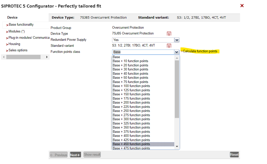 옵션을 선택하고 나서 Function points class를 선택해주어야하는데요. 보통 Base로 커버가 가능합니다. Function 수량이 늘어날수록 계전기의 단가가 비싸진다는 것을 명심하시기를 바랍니다. Function에 어떻한것을 넣을지 수량과 ANSI넘버를 조회해서 계산해볼 수 있는데요. 우측에 노랑색으로 칠한 Calculate function points를 클릭해주시면 확인할 수 있습니다.
