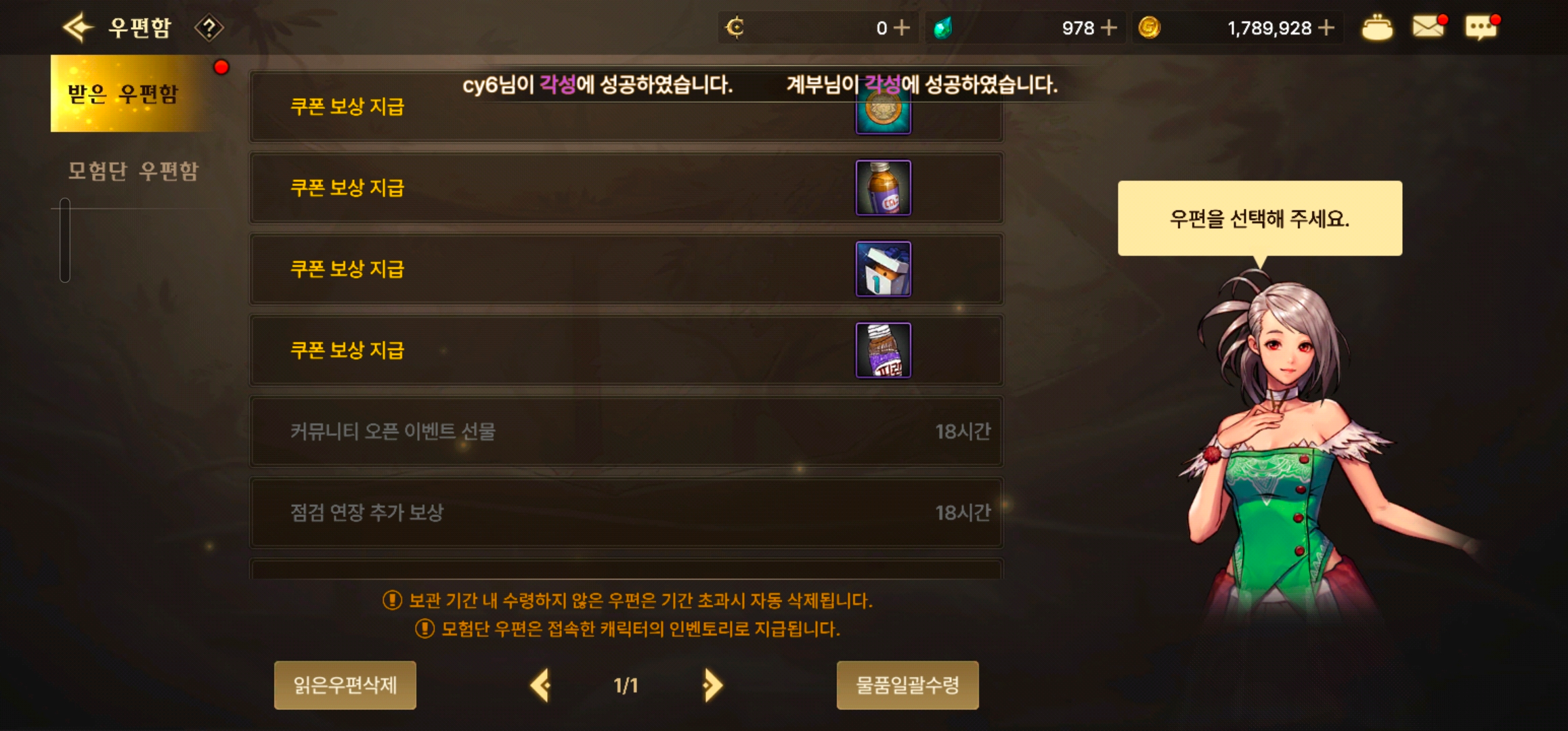 4. 쿠폰 번호를 입력하면 아래와 같이 우편함으로 들어옵니다. 입력 완료!